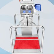 Sole of shoes are cleaned only with a dry curly hygienic mat. For hand disinfection, both hands should be inserted into the 2 separate compartments that are located in front of the machine at the same time; the solution is sprayed as soon as the hands are detected by the sensors. There are Red / Green LED warning lamps showing that the process is done and completed or not. After the hands disinfection process of the person was completed, only then turnstile will be unlocked and allow the passage.